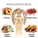 • Contraste radiante y floral: Abre con una explosión luminosa de durazno jugoso y bergamota. A los pocos minutos revela un corazón inmaculado de flor de naranjo y el jazmín, para finalmente fundirse en un secado sumamente elegante de madera de sándalo, y la sensualidad dulce del praliné.